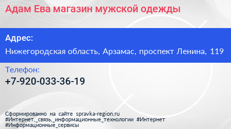 Адам & Ева, магазин мужской одежды по адресу Нижегородская область, Арзамас, проспект Ленина, 119 в дальнейшем Организация, размещена в следующих категориях: