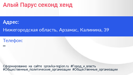 Алый Парус, секонд-хенд по адресу Нижегородская область, Арзамас, Калинина, 39 в дальнейшем Организация, размещена в следующих категориях:
