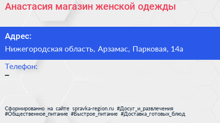 Анастасия, магазин женской одежды по адресу Нижегородская область, Арзамас, Парковая, 14а в дальнейшем Организация, размещена в следующих категориях: