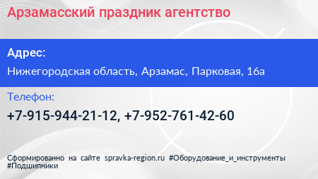 Арзамасский праздник, агентство по адресу Нижегородская область, Арзамас, Парковая, 16а в дальнейшем Организация, размещена в следующих категориях:
