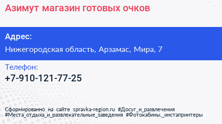 Азимут, магазин готовых очков по адресу Нижегородская область, Арзамас, Мира, 7 в дальнейшем Организация, размещена в следующих категориях: