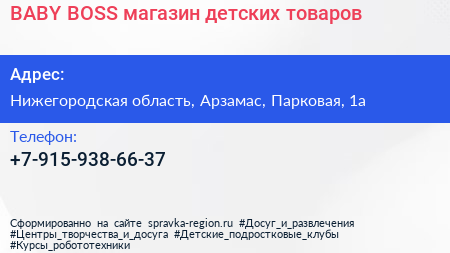 BABY BOSS, магазин детских товаров по адресу Нижегородская область, Арзамас, Парковая, 1а в дальнейшем Организация, размещена в следующих категориях: