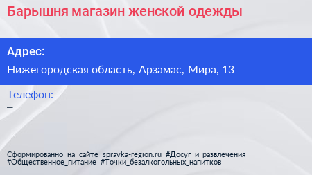 Барышня, магазин женской одежды по адресу Нижегородская область, Арзамас, Мира, 13 в дальнейшем Организация, размещена в следующих категориях: