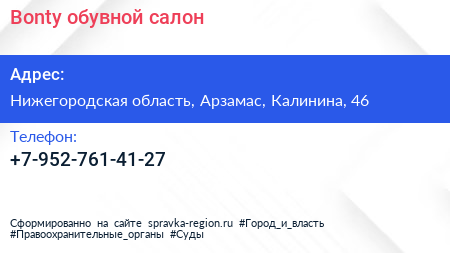 Bonty, обувной салон по адресу Нижегородская область, Арзамас, Калинина, 46 в дальнейшем Организация, размещена в следующих категориях: