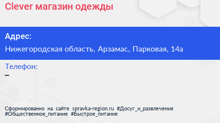 Clever, магазин одежды по адресу Нижегородская область, Арзамас, Парковая, 14а в дальнейшем Организация, размещена в следующих категориях: