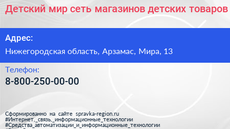 Детский мир, сеть магазинов детских товаров по адресу Нижегородская область, Арзамас, Мира, 13 в дальнейшем Организация, размещена в следующих категориях: