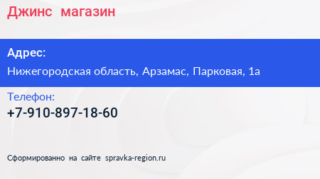 Джинс+, магазин по адресу Нижегородская область, Арзамас, Парковая, 1а в дальнейшем Организация, размещена в следующих категориях: