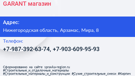 GARANT, магазин по адресу Нижегородская область, Арзамас, Мира, 8 в дальнейшем Организация, размещена в следующих категориях: