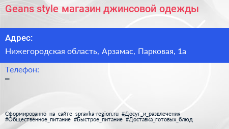 Geans style, магазин джинсовой одежды по адресу Нижегородская область, Арзамас, Парковая, 1а в дальнейшем Организация, размещена в следующих категориях: