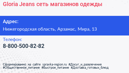 Gloria Jeans, сеть магазинов одежды по адресу Нижегородская область, Арзамас, Мира, 13 в дальнейшем Организация, размещена в следующих категориях: