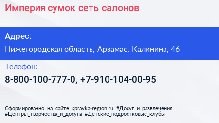 Империя сумок, сеть салонов по адресу Нижегородская область, Арзамас, Калинина, 46 в дальнейшем Организация, размещена в следующих категориях: