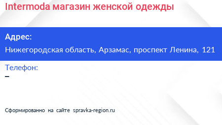 Intermoda, магазин женской одежды по адресу Нижегородская область, Арзамас, проспект Ленина, 121 в дальнейшем Организация, размещена в следующих категориях:
