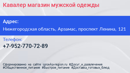 Кавалер, магазин мужской одежды по адресу Нижегородская область, Арзамас, проспект Ленина, 121 в дальнейшем Организация, размещена в следующих категориях: