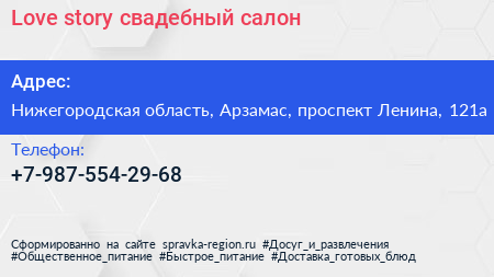 Love story, свадебный салон по адресу Нижегородская область, Арзамас, проспект Ленина, 121а в дальнейшем Организация, размещена в следующих категориях: