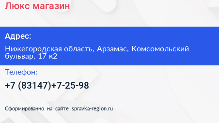 Люкс, магазин по адресу Нижегородская область, Арзамас, Комсомольский бульвар, 17 к2 в дальнейшем Организация, размещена в следующих категориях: