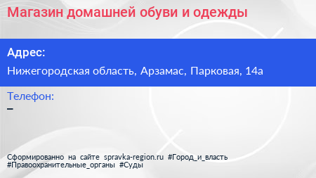 Магазин домашней обуви и одежды по адресу Нижегородская область, Арзамас, Парковая, 14а в дальнейшем Организация, размещена в следующих категориях: