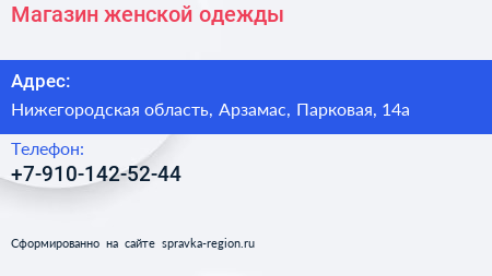 Магазин женской одежды по адресу Нижегородская область, Арзамас, Парковая, 14а в дальнейшем Организация, размещена в следующих категориях: