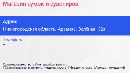 Магазин сумок и сувениров по адресу Нижегородская область, Арзамас, Зелёная, 32а в дальнейшем Организация, размещена в следующих категориях:
