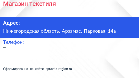 Магазин текстиля по адресу Нижегородская область, Арзамас, Парковая, 14а в дальнейшем Организация, размещена в следующих категориях: