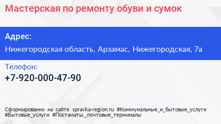 Мастерская по ремонту обуви и сумок по адресу Нижегородская область, Арзамас, Нижегородская, 7а в дальнейшем Организация, размещена в следующих категориях: