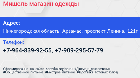 Мишель, магазин одежды по адресу Нижегородская область, Арзамас, проспект Ленина, 121г в дальнейшем Организация, размещена в следующих категориях:
