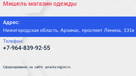 Мишель, магазин одежды по адресу Нижегородская область, Арзамас, проспект Ленина, 131в в дальнейшем Организация, размещена в следующих категориях:
