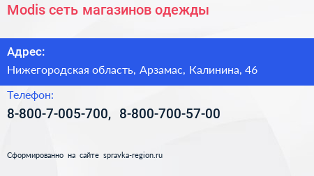 Modis, сеть магазинов одежды по адресу Нижегородская область, Арзамас, Калинина, 46 в дальнейшем Организация, размещена в следующих категориях: