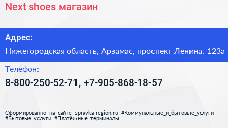 Next shoes, магазин по адресу Нижегородская область, Арзамас, проспект Ленина, 123а в дальнейшем Организация, размещена в следующих категориях: