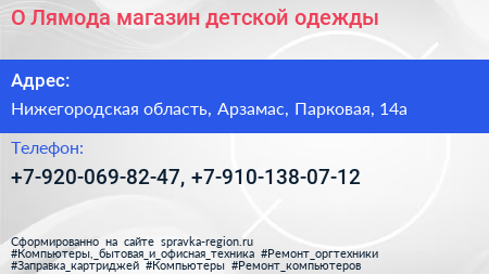 О`Лямода, магазин детской одежды по адресу Нижегородская область, Арзамас, Парковая, 14а в дальнейшем Организация, размещена в следующих категориях: