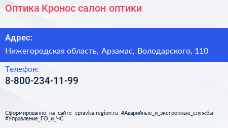 Оптика Кронос, салон оптики по адресу Нижегородская область, Арзамас, Володарского, 110 в дальнейшем Организация, размещена в следующих категориях: