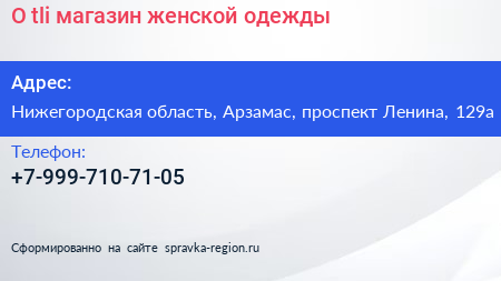 O`tli, магазин женской одежды по адресу Нижегородская область, Арзамас, проспект Ленина, 129а в дальнейшем Организация, размещена в следующих категориях: