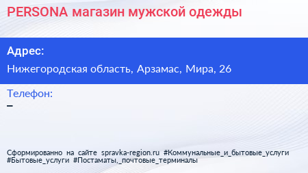 PERSONA, магазин мужской одежды по адресу Нижегородская область, Арзамас, Мира, 26 в дальнейшем Организация, размещена в следующих категориях: