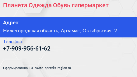 Планета Одежда Обувь, гипермаркет по адресу Нижегородская область, Арзамас, Октябрьская, 2 в дальнейшем Организация, размещена в следующих категориях: