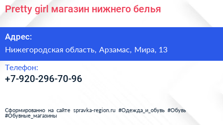 Pretty girl, магазин нижнего белья по адресу Нижегородская область, Арзамас, Мира, 13 в дальнейшем Организация, размещена в следующих категориях: