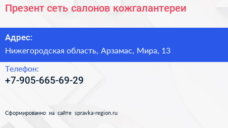 Презент, сеть салонов кожгалантереи по адресу Нижегородская область, Арзамас, Мира, 13 в дальнейшем Организация, размещена в следующих категориях: