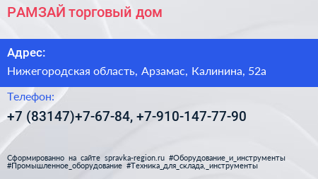 РАМЗАЙ, торговый дом по адресу Нижегородская область, Арзамас, Калинина, 52а в дальнейшем Организация, размещена в следующих категориях: