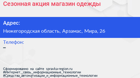 Сезонная акция, магазин одежды по адресу Нижегородская область, Арзамас, Мира, 26 в дальнейшем Организация, размещена в следующих категориях: