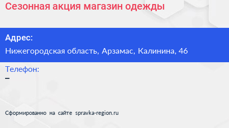 Сезонная акция, магазин одежды по адресу Нижегородская область, Арзамас, Калинина, 46 в дальнейшем Организация, размещена в следующих категориях:
