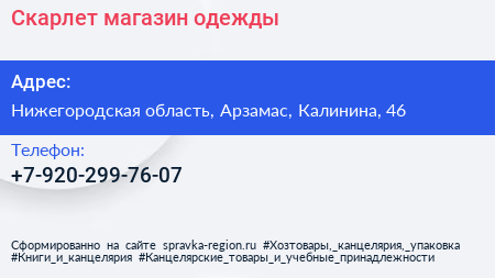 Скарлет, магазин одежды по адресу Нижегородская область, Арзамас, Калинина, 46 в дальнейшем Организация, размещена в следующих категориях: