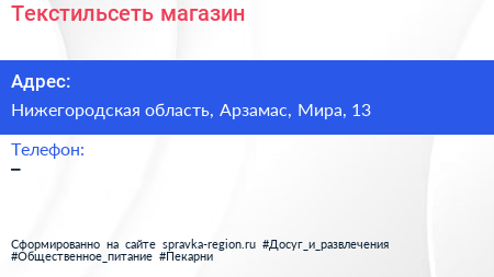 Текстильсеть, магазин по адресу Нижегородская область, Арзамас, Мира, 13 в дальнейшем Организация, размещена в следующих категориях: