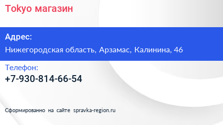 Tokyo, магазин по адресу Нижегородская область, Арзамас, Калинина, 46 в дальнейшем Организация, размещена в следующих категориях: