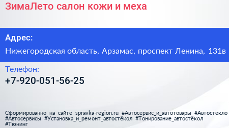 ЗимаЛето, салон кожи и меха по адресу Нижегородская область, Арзамас, проспект Ленина, 131в в дальнейшем Организация, размещена в следующих категориях:
