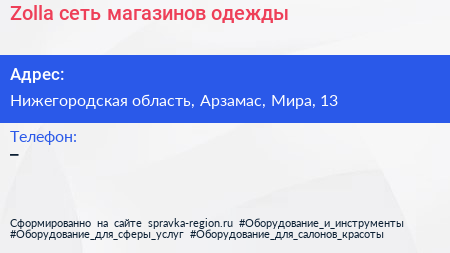 Zolla, сеть магазинов одежды по адресу Нижегородская область, Арзамас, Мира, 13 в дальнейшем Организация, размещена в следующих категориях:
