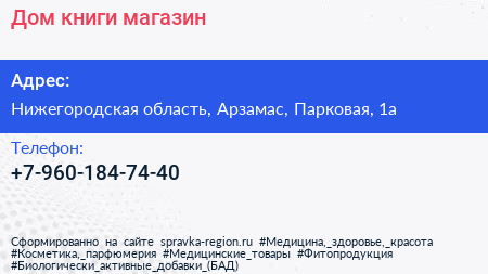 Дом книги, магазин по адресу Нижегородская область, Арзамас, Парковая, 1а в дальнейшем Организация, размещена в следующих категориях: