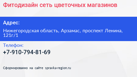 Фитодизайн, сеть цветочных магазинов по адресу Нижегородская область, Арзамас, проспект Ленина, 121г/1 в дальнейшем Организация, размещена в следующих категориях: