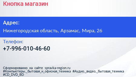 Кнопка, магазин по адресу Нижегородская область, Арзамас, Мира, 26 в дальнейшем Организация, размещена в следующих категориях: