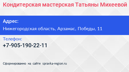 Кондитерская мастерская Татьяны Михеевой по адресу Нижегородская область, Арзамас, Победы, 11 в дальнейшем Организация, размещена в следующих категориях: