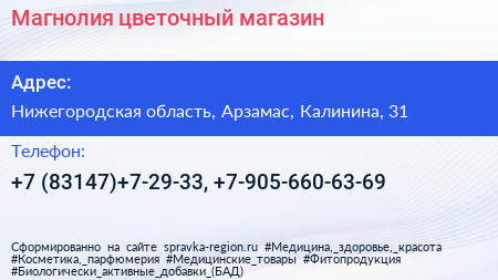Магнолия, цветочный магазин по адресу Нижегородская область, Арзамас, Калинина, 31 в дальнейшем Организация, размещена в следующих категориях: