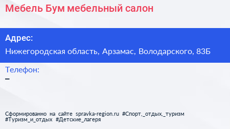 Мебель Бум, мебельный салон по адресу Нижегородская область, Арзамас, Володарского, 83Б в дальнейшем Организация, размещена в следующих категориях: