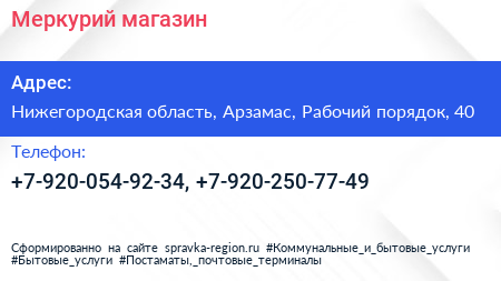 Меркурий, магазин по адресу Нижегородская область, Арзамас, Рабочий порядок, 40 в дальнейшем Организация, размещена в следующих категориях: